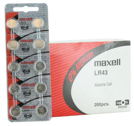 PLEASE NOTE: 2 battery minimum order. Batteries are packaged in sets of 2 but are sold by the piece. Please order in multiples of 2. Maxell LR43 Coin Cell Battery, 1PC Maxell Coin Cell Battery LR43 is most often used in pedometers as well as some calculators, toys, electronics, and timepieces. Have safe, long-lasting operation in your devices with a 0% mercury design! Brand / Type: Maxell Model: LR43 Chemistry: Alkaline Output Voltage: 1.5V Height: 4.2mm Weight: 1.5g Diameter: 11.6mm Capacity: 55mAh Equivalent Battery Types: AWI M10, S06, S07, Berec BLR43, B-SR43H, B-SR43L, Bulova 120TC, 226, 260, Citizen 280-01, 280-16, 280-21, 280-41, 280-47, CNB G12A, Duracell D186, D186A, D301, D386, Energizer BS06, BSR43H,, Eveready 186, 186A, 301, 386, Gold Peak GP186, GP86, GP86A, GP01, I.E.C. LR43, SR43, SR1142, Maxell LR43, SR43W, G12, SR43SW, NEDA 1132SO, 1133SO, 1167A, Omega 9902, Panasonic LR43, SP301, SP386, WL11, Rayovac RW24, RW34, RW44, RW84, RW14, Renata 1, 6, LR43, Seiko SB-A8, SBA8, SB-BB, SBB, SB-D8, SBD8,, Sony LR43, SR43W, SR43SW, Varta 528, 548, V12GA, V301, V386, Vinnic L1142, S1142S, Other AG12, G12, GS12, SG12, 10L24, WG12, WG512, WG-512, 528, 568, Other 86A, LR1142 collection: 1.5V Batteries; product type: Batteries – Button/Coin Cell – Alkaline Item Details Brand Maxell SKU MAXELL-LR43 MPN MAXELL-LR43 UPC 025215445361 Size LR43 Voltage 1.5 Battery Rechargeable No Chemistry Alkaline Packaging Tear Strip QTY Per Package 1 California Residents see Prop 65 WARNINGS Specifications Size LR43 Voltage 1.5 Battery Rechargeable No Integrated Charge Port No Unit Dimensions Weight 0.01 oz (0 g) Packaging/Shipping Dimensions Shipping Weight 0.01 lb Documents Data Sheet Additional Details Packaging Tear Strip Warranty Battery Junction Warranty Return Policy Return Policy